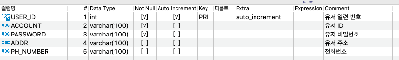 해당 데이터를 담을 데이터베이스에는 USER 테이블이 있으며 칼럼에는 USER_ID, ACCOUNT, PASSWORD, ADDR, PH_NUMBER가 있습니다.