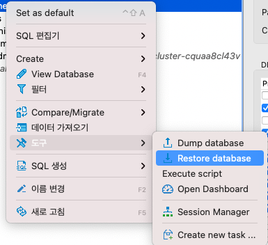 데이터베이스 툴에서, B계정의 데이터베이스에서 오른쪽 클릭 후 "Restore database"를 클릭해줍니다.