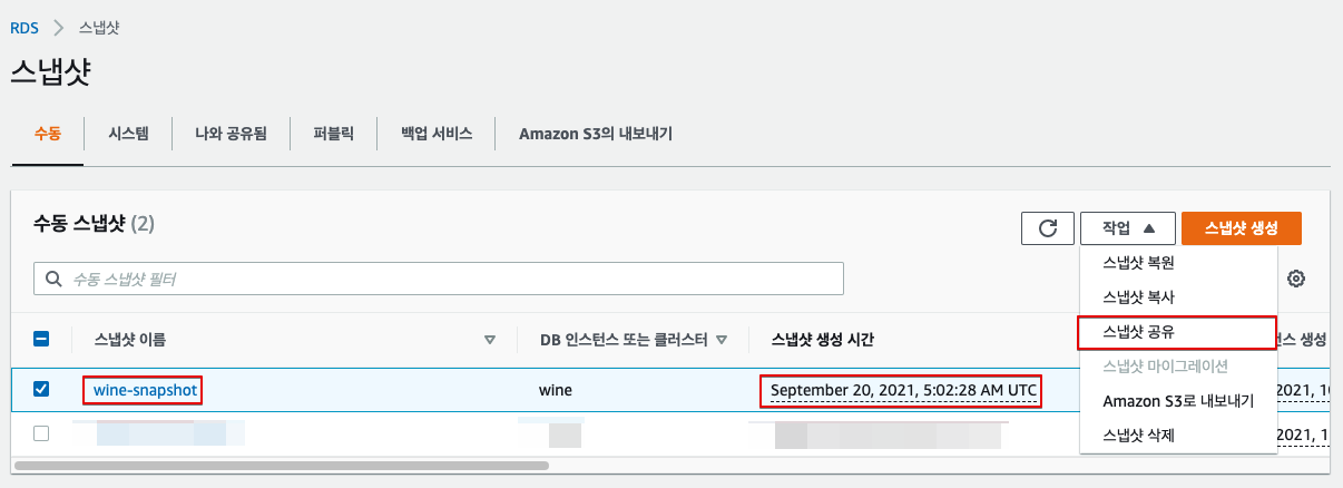 스냅샷을 생성하고 일정 시간이 지나고, "스냅샷 생성 시간"에 날짜가 찍히면 "스냅샷 공유"를 할 수 있습니다.
