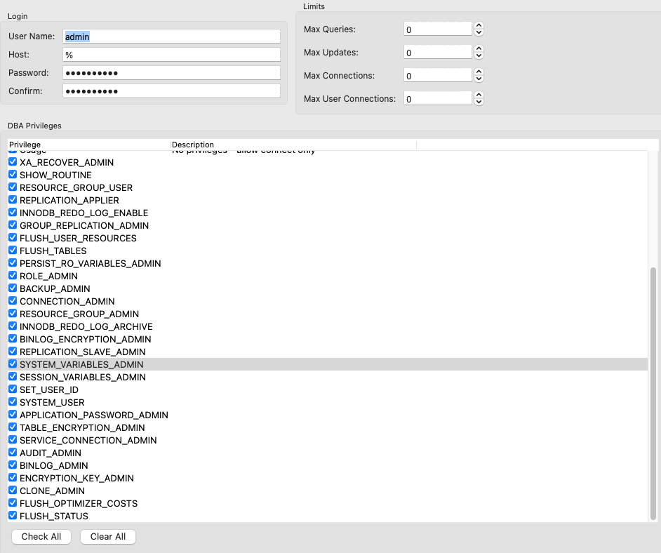 ADMIN 계정에 대한 모든 권한을 체크하는 게 아니라, 아까 덤프로 restore 할 때 나왔던 권한 부족 에러에서 말한 권한 중, 하나만 체크해 주었습니다. 그중 SYSTEM_VARIABLES_ADMIN 권한을 체크해주고 저장해줬습니다.