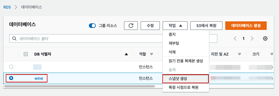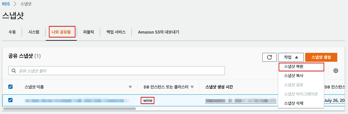 해당 스냅샷을 선택한 후, "작업"의 "스냅샷 복원"을 클릭하여 원하는 데이터베이스 옵션으로 데이터베이스 복원을 시작하면 완료됩니다.