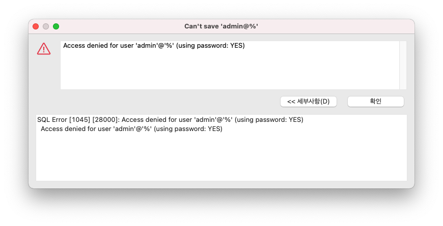 이 에러를 보고 비밀번호를 틀린 건가, 권한 설정을 잘못했나 하고 찾아봤지만 문제는 없었습니다.