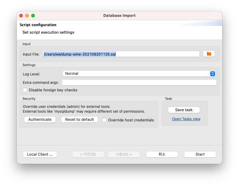 3. B계정의 데이터베이스에서, 이전에 생성한 덤프로 restore