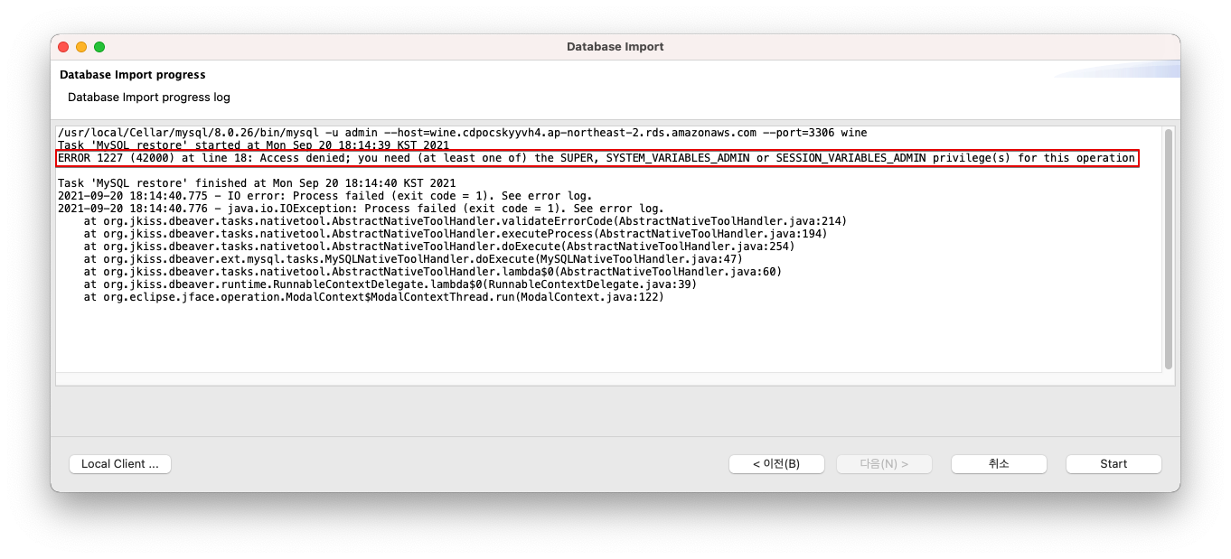 에러 문을 살펴보면, 계정에 권한이 충분하지 않다고, 해당 작업을 진행하려면 SUPER, SYSTEM_VARIABLES_ADMIN, SESSION_VARIABLES_ADMIN 중 하나의 권한이 필요하다고 합니다.