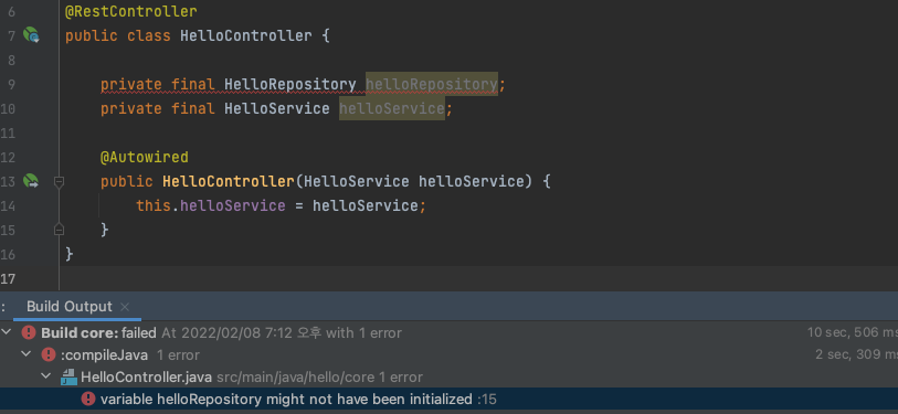 위 코드에서, 생성자 부분에서 HelloRepository에 대한 초기화 코드를 누락한 상태로 애플리케이션을 실행하면, 컴파일 단계에서 에러가 발생합니다.