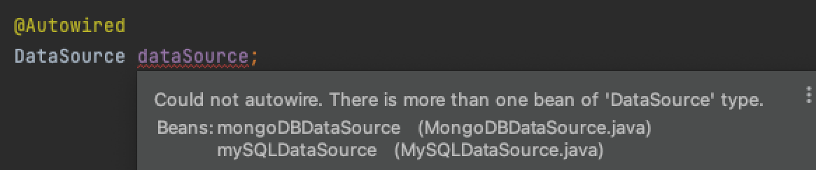 DataSource 인터페이스를 구현하는 MySQLDataSource, MongoDBDataSource를 @Component 어노테이션으로 Bean Container 등록하는 경우, 둘 다 DataSource 타입이기 때문에, 타입을 기준으로 Bean Container에서 주입할 Bean을 찾는 방식인 @Autowired을 사용하면, 아래 사진처럼 DataSource 타입이 2개라서 어느 걸 주입해야 할지 모르겠습니다!라고 합니다.