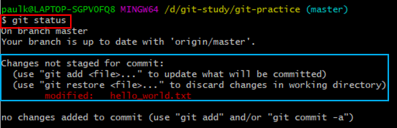 hello_world.txt 파일을 수정하고 git status로 확인해 보았습니다.