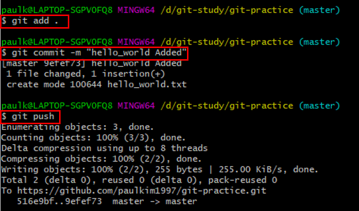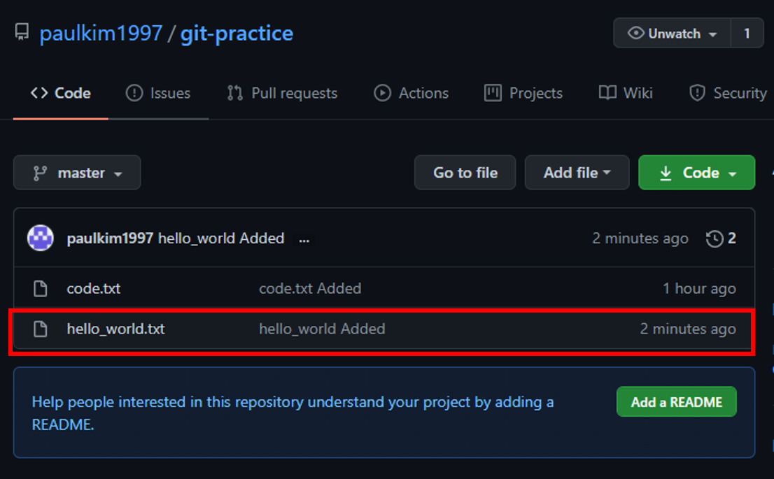 이상태에서 git add hello_world.txt, git commit -m "커밋 메시지", git push 명령어를 입력하면 원격 저장소에 수정사항이 반영될 것입니다.