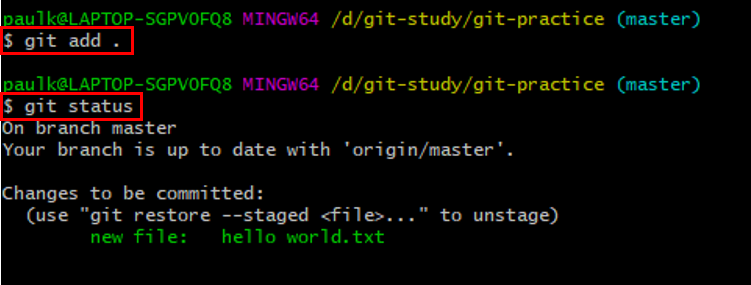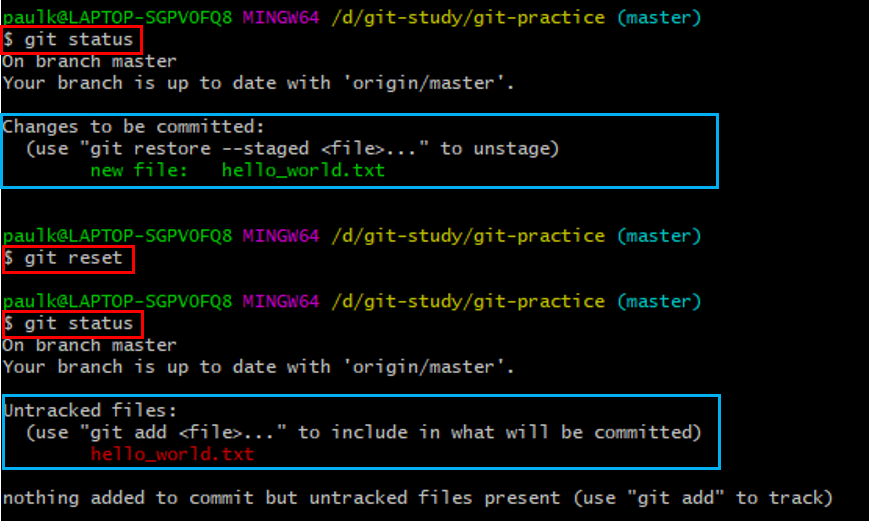 git add를 통해 staging area에 올린 hello_world.txt 파일을 git reset을 통해 내리고 git status로 확인해 보았습니다.