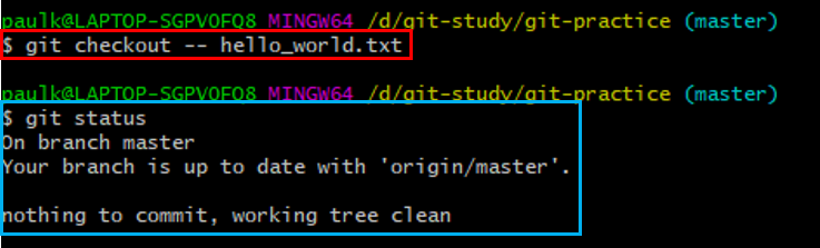 이때 사용되는 명령어는 git checkout -- 명령어입니다.