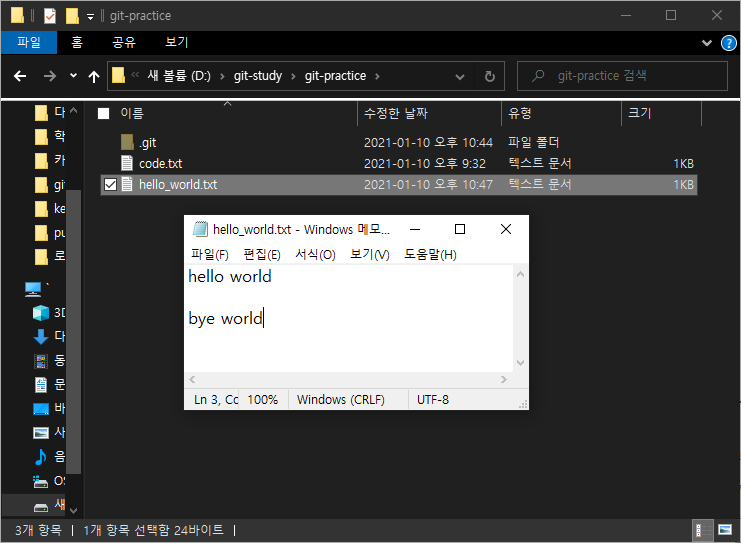 hello_world.txt 파일에 bye world라는 문자열을 추가해 주었습니다.