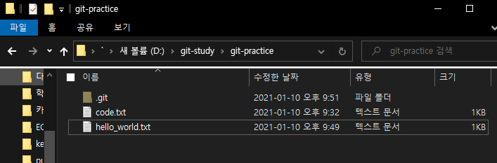 code.txt는 기존에 존재했던 문서, hello_world.txt는 방금 추가해준 문서입니다.