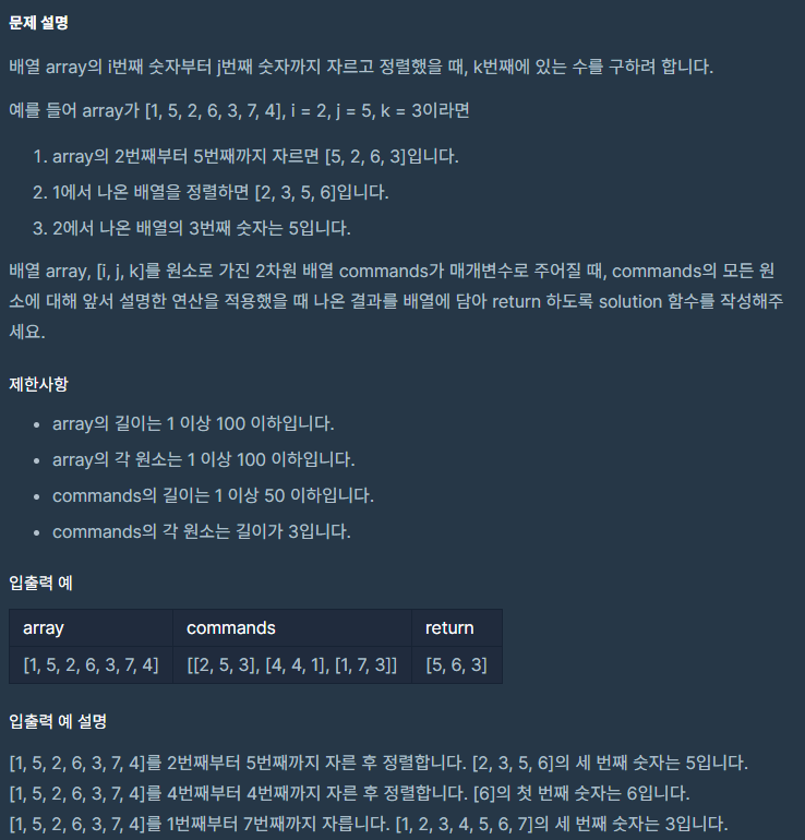 이때 array의 해당 index에 있는 값을 하나의 배열에 담아주고, 해당 배열을 정렬하고 commands의 마지막 원소인 K번째 수를 꺼내서 답으로 제출하면 된다.