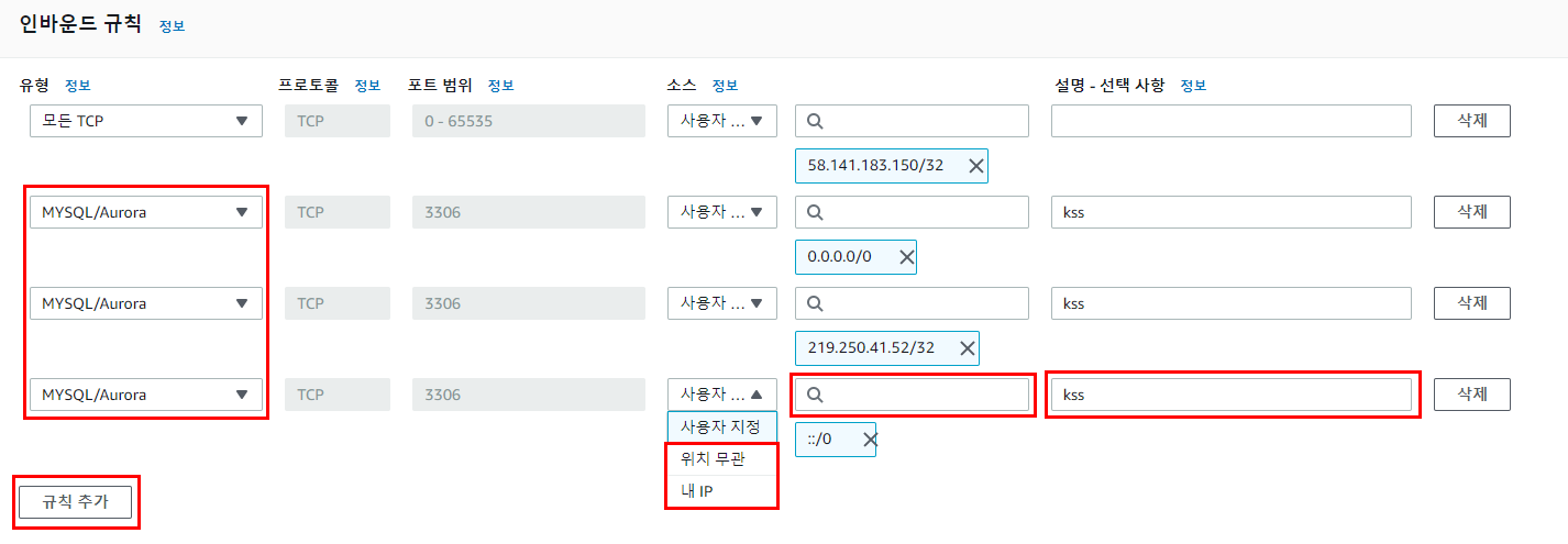 왼쪽에 인바운드 유형에서 [MYSQL/Aurora] 옵션을 선택해주시면 프로토콜과 포트범위 옵션이 자동으로 채워집니다.