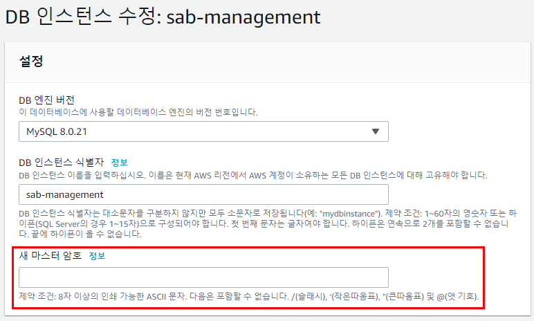 - Password: 마스터 사용자 암호