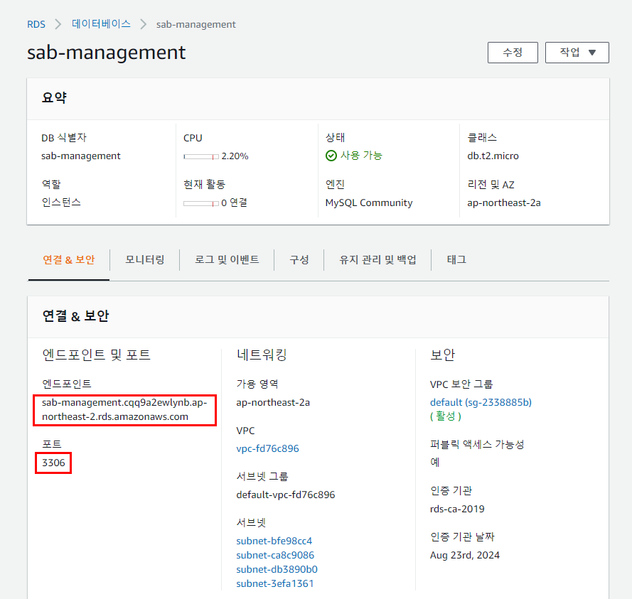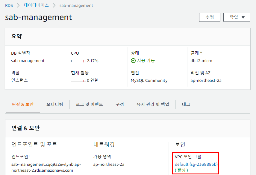 엔드포인트와 포트번호는 RDS 인스턴스 이름을 클릭하자마자 확인할 수 있습니다