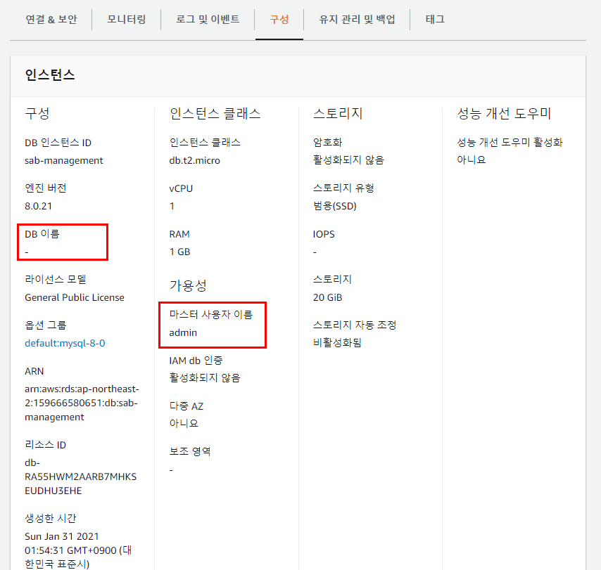 DB이름과 마스터 사용자 이름은 대시보드에서 구성을 클릭해 확인할 수 있습니다.