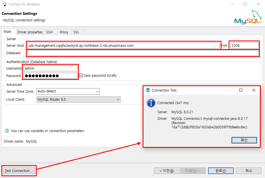 모든 정보를 입력하고 [Test Connection] 버튼을 클릭하면 성공했다는 팝업창이 뜨게됩니다.