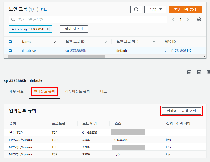 선택한 RDS인스턴스의 대시보드에서 [VPC 보안 그룹]을 선택하면, 해당 RDS에 적용되어있는 보안 그룹 옵션들을 원하는 대로 편집할 수 있습니다.