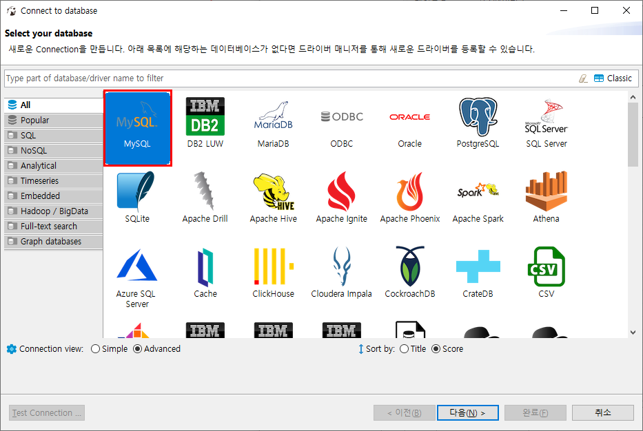 AWS의 MySQL RDS인스턴스에 접속 할 것이기 때문에 MySQL 데이터베이스를 선택해 줍니다.