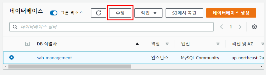 마스터 사용자 암호와 퍼블릭 접근 옵션은 대시보드에서 확인하고 싶은 RDS인스턴스를 선택하고 [수정] 버튼을 눌러줍니다.
