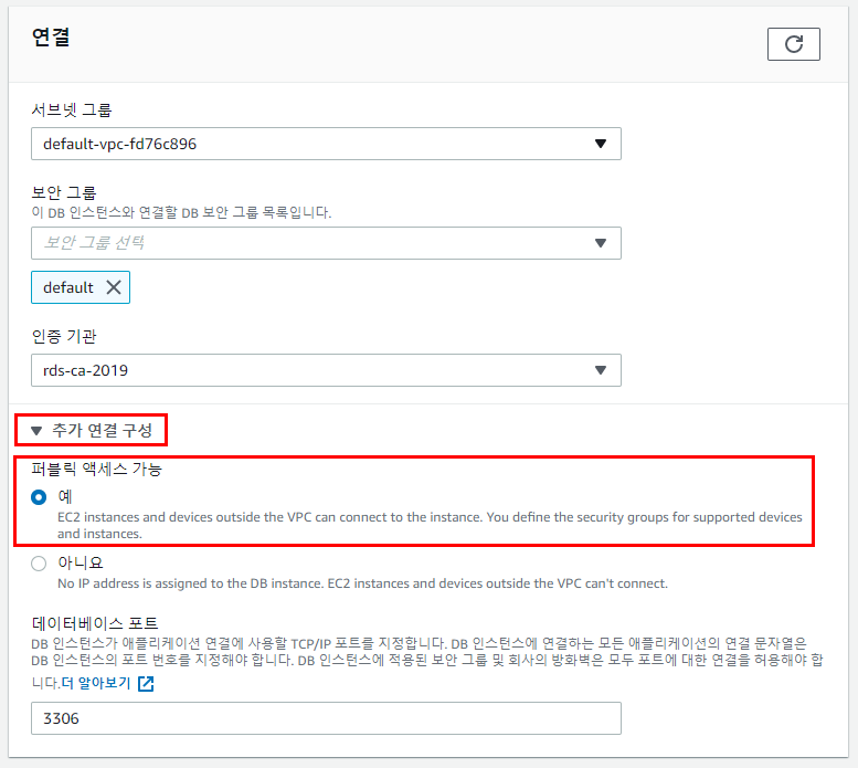 스크롤을 더 하다 보면 [연결] 옵션에서 [추가 연결 구성]을 선택해 [퍼블릭 액세스 가능] 옵션을 "예"로 선택해주면 됩니다.
