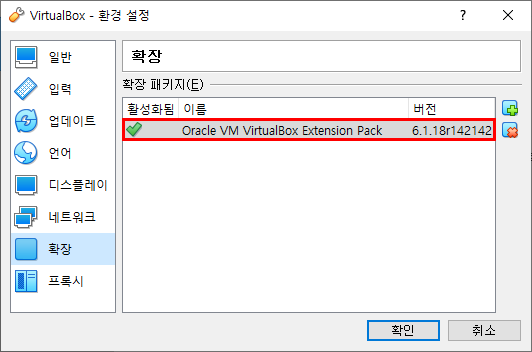 확장팩도 설치가 완료되면, Virtual Box의 확장팩 부분에서 설치가 완료된 확장팩을 확인할 수 있습니다.