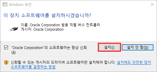 설치 도중, 다음과 같은 창이 뜨는데, [설치]를 눌러 설치해 주시면 됩니다.