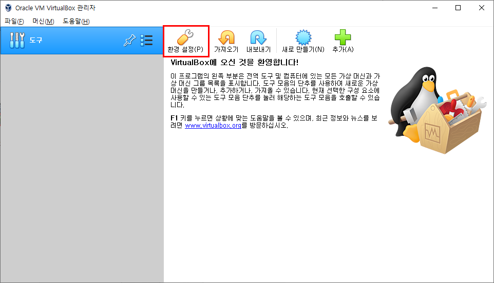 Virtual Box의 설치가 끝나면 다음과 같은 프로그램이 실행됩니다.