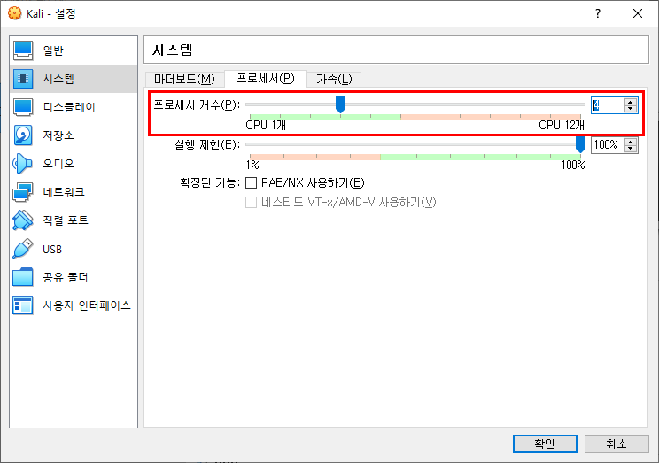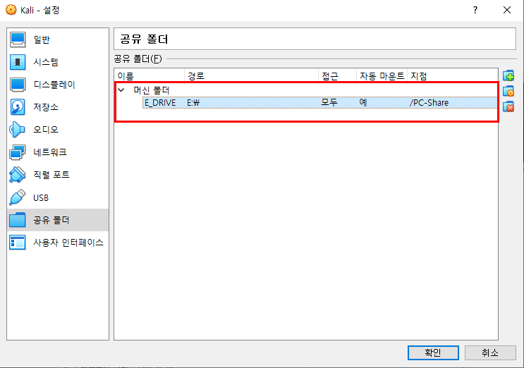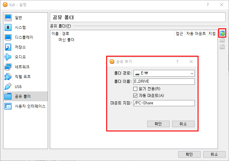 공유 폴더는 Kali Linux와 기존 OS가 공유하는 폴더를 설정해 줍니다.