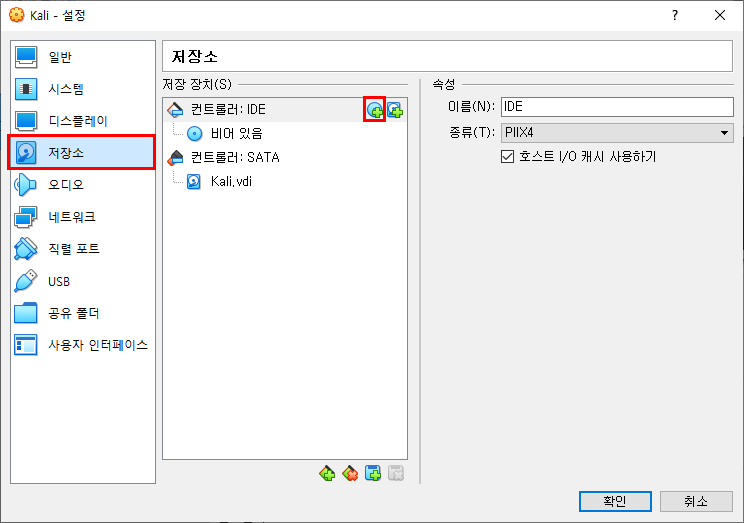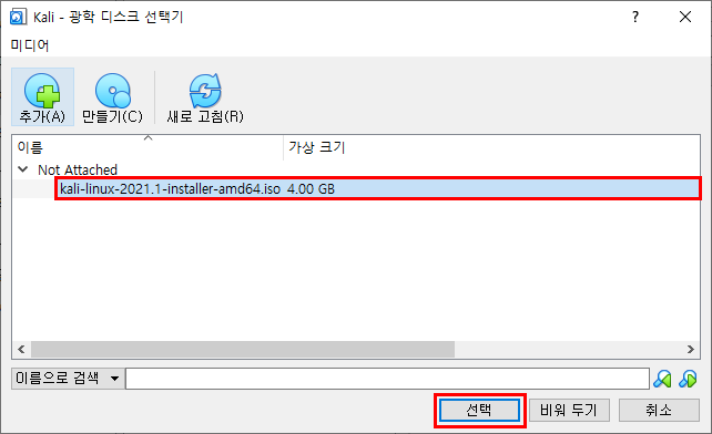 다음과 같은 화면이 뜨는데, [추가]를 눌러 사전에 다운로드 한 Kali Linux 이미지 ISO 파일을 선택해 줍니다.