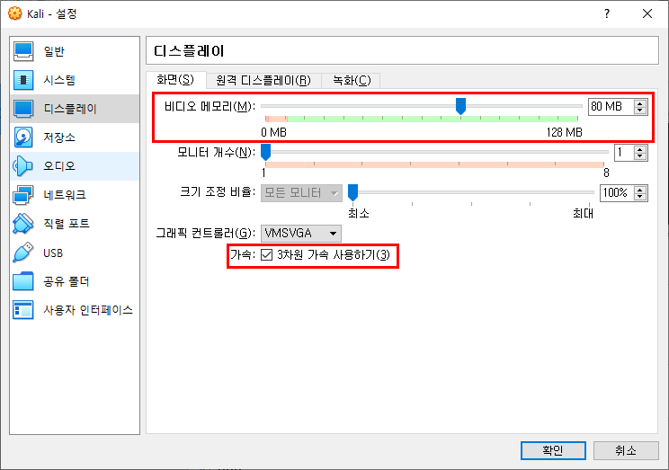 비디오 메모리와 3차원 가속을 다음과 같이 설정해 줍니다.