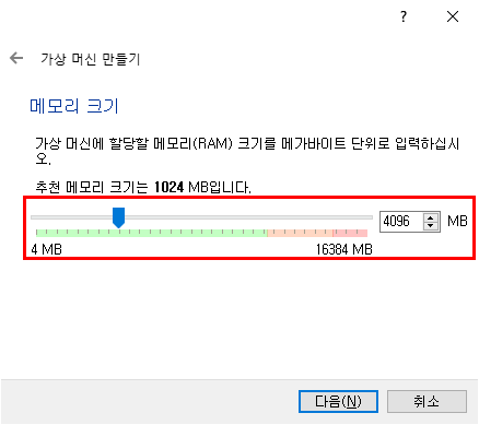 시스템의 기본 메모리는 4096MB을 할당하고, 추후 여유가 되면 더 할당해 주시면 됩니다.