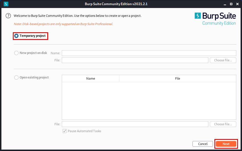 현재 저희가 사용하고 있는 Burp Suite은 Community Edition으로 [Temporary Project] 옵션만 선택 가능합니다.