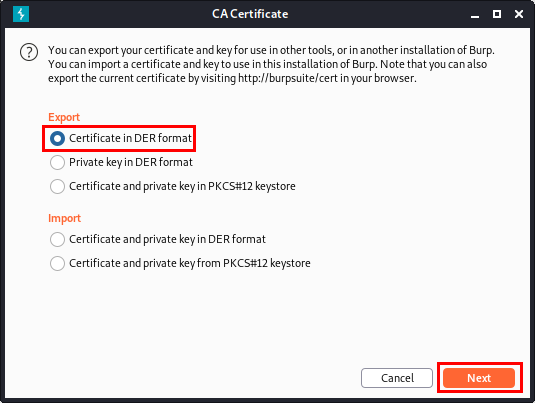다음과 같이 [Certificate in DER formate] 옵션을 선택하고 [Next]를 클릭해줍니다.