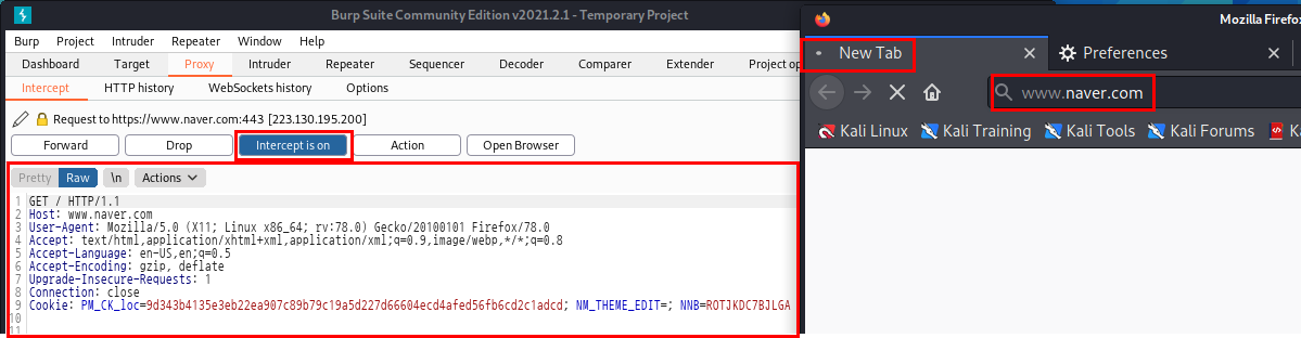 Burpsuite을 켜놓은 상태에서 브라우저에서 naver.com을 입력해 접속을 시도하면, 로딩이 무한 반복되고 있고, 웹 브라우저에서 서버로 보낸 요청이 Burpsuite에 걸려 데이터를 확인할 수 있습니다.