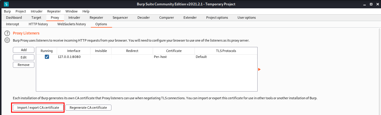 다시 Burpsuite으로 돌아와 [Proxy]의 [Options]에 [Import/export CA certificate]을 클릭해줍니다.