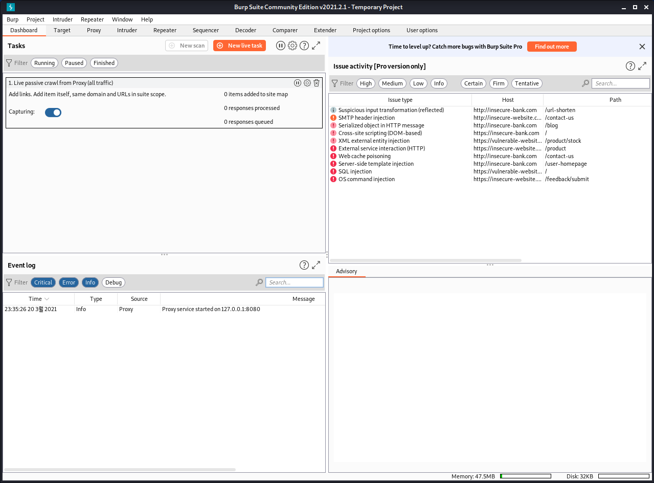 그럼 최종적으로 다음과 같이 Burpsuite이 실행된 걸 볼 수 있습니다.