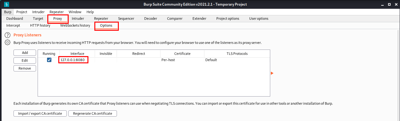 [Settings]를 클릭해 설정을 하기 전, Burpsuite의 [Proxy]에서 [Options]를 확인하면, Burpsuite이 127.0.0.1:8080을 Listening 하고 있다는 것을 확인할 수 있습니다.
