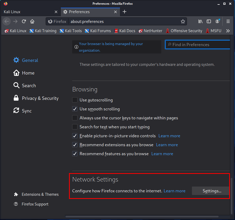 Foxy Proxy 사용 이유 현재 Kali Linux의 웹 브라우저의 네트워크 설정은 다음과 같이 되어있습니다. 이 설정은 인위적으로 프록시 서버를 사용하겠다는 의미이고, 저희의 프록시 서버 역할을 하는 애