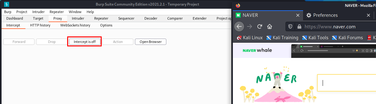 Burpsuite을 계속 실행시켜 놔야지 정상적인 웹 서핑이 가능하니, 이 점이 불편하다고 생각하신 분들은 다음 포스팅을 참고하시면 해결할 수 있습니다.