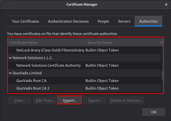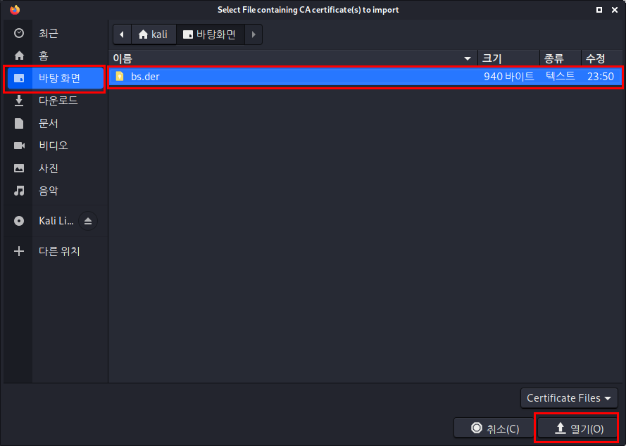 [Import]를 눌러 아까 만들어준 Burpsuite certificate인 "bs.der" 파일을 선택해줍니다.