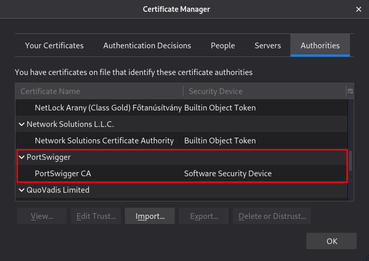 쭉 내려보면, Burpsuite을 만든 회사인 PortSwigger에 대한 cerificate이 없는 것 을 확인할 수 있습니다.