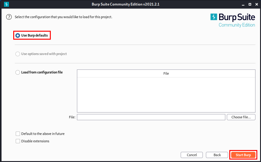 [Use Burp defaults]를 선택해 다음으로 넘어가 줍니다.