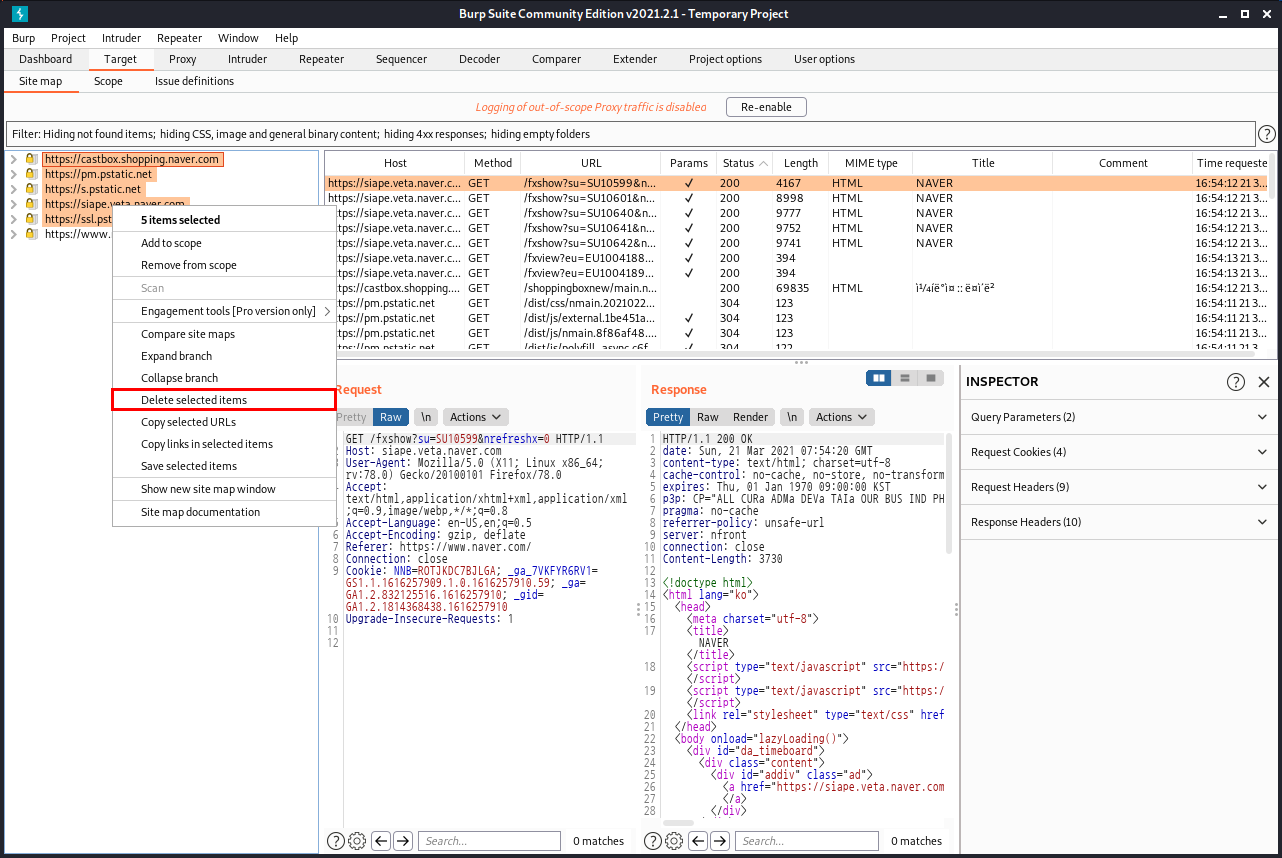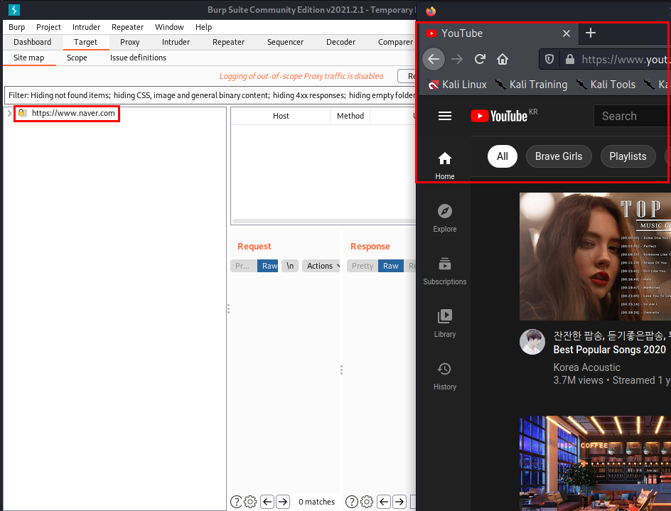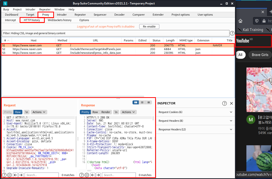 [Target]의 [Site Map] 외에도 [Proxy]의 [HTTP History] 부분을 보면 Scope에 추가한 네이버에 관한 클라이언트 측의 요청, 서버 측의 반응을 확인할 수 있고, 유튜브에 접속한다 하더라도 Scope에 추가되어 있지 않기 때문에 HTTP History에 뜨지 않는 것을 확인할 수 있습니다.
