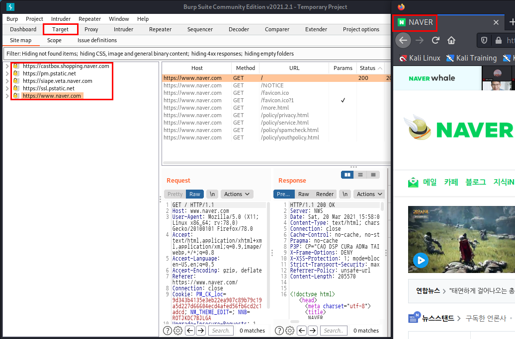 Burpsuite을 켜고, [Proxy]의 [Intercept]에서 인터셉트를 꺼주고, 네이버에 접속하면 다음과 같은 화면이 로딩됩니다.