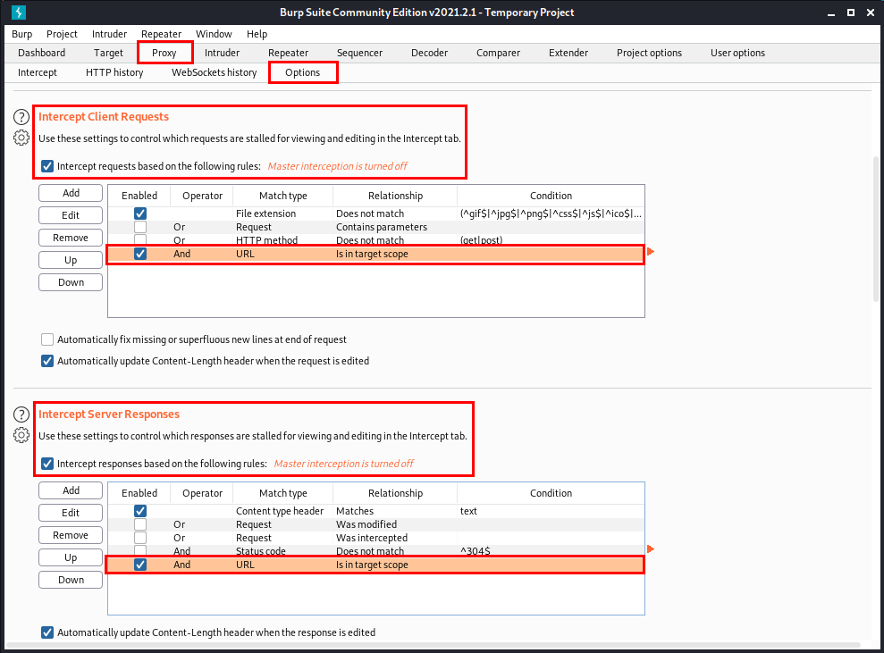 다음 옵션들은 프록시가 인터셉트를 할 때, 클라이언트의 요청과 서버 측의 반응을 모두 인터셉트하고, "Is in target scope"를 활성화시켜주면서 저희가 Scope에 추가한 사이트만 인터셉트하겠다는 의미입니다.