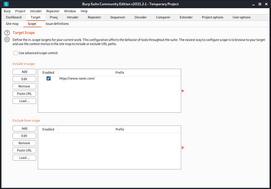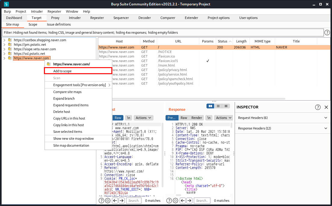www.naver.com에 오른쪽 클릭을 하고 Add to Scope를 해줍니다.