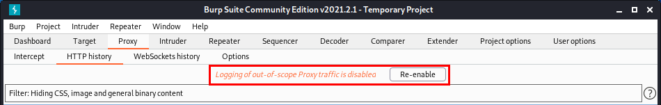 해당 사진은 Scope 외의 사이트들에 대해서도 HTTP History를 잡고 싶으면 [Re-enable]을 클릭해 Scope 외의 사이트 들에서도 요청과 반응을 확인할 수 있습니다.