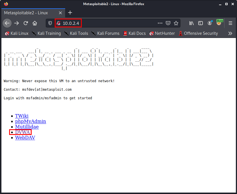 먼저 repeater를 사용하기 위해 Metasploitable2의 DVWA라는 애플리케이션에 접속해 보겠습니다.